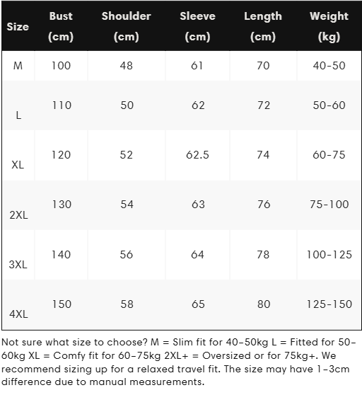 Our ADORI Backpack Hoodie comes in M, L, XL, XXL, 3XL, and 4XL. Please check our size guide for exact measurements.